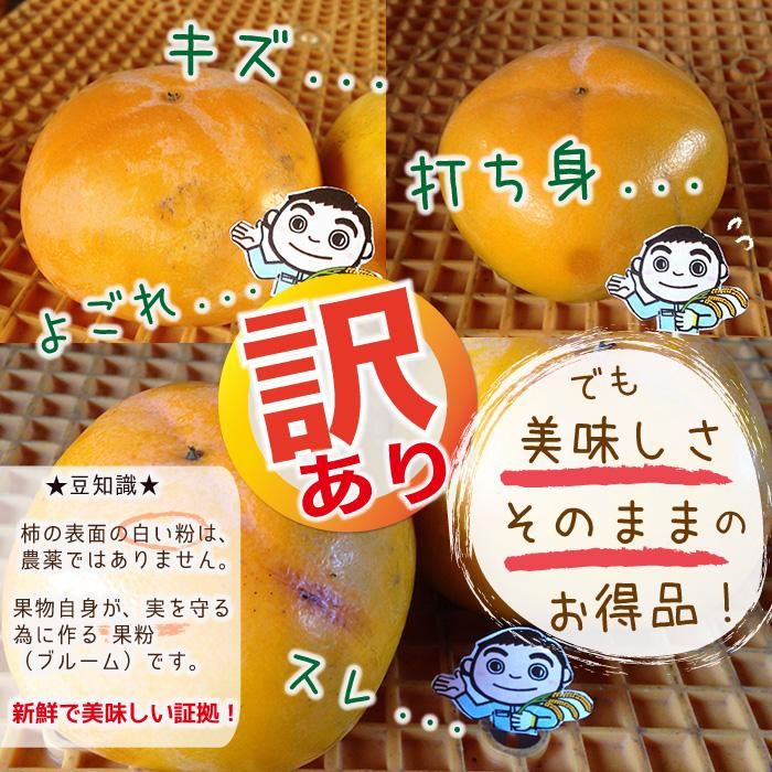 ヒョウ被害、枝キズ、奇形などの理由で訳ありとなった商品です。※柿はヘタの部分でカットしておりますので、枝は付いておりません。